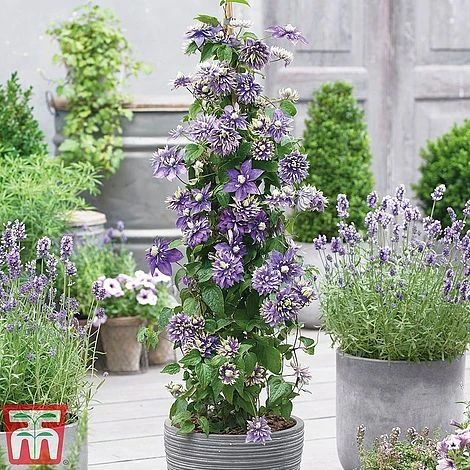 - Clematis florida ‘Taiga’ – Fully hardy and fast growing, this vigorous, uniquely coloured clematis will flower from June to September, getting better and better each year. Masses of contrasting lilac and gold domed flowers set against dense foliage will transform walls and fences into floral showpieces. See how quickly the open buds develop into sumptious, multiple layered flowers. Easy to grow in beds and pots. Height 200cm (79″). Spread 100cm (39″). Pruning group 3. Flowering Period: July – September