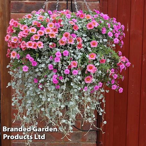 Our Coral Falls pre-planted basket creates the perfect display without all the hard work! This arrangement is a waterfall of colour, with the sunset shades of trailing salmon and pink Calibrachoa against the spectacular shimmering foil of Dichondra ‘Silver Falls’.