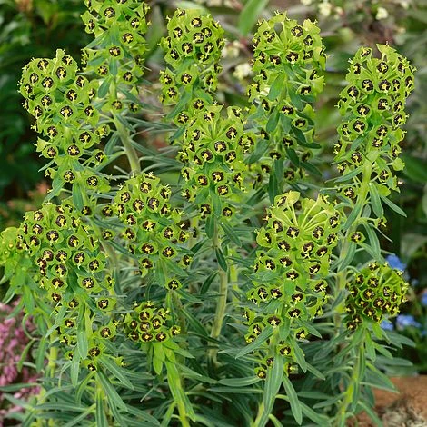 A unique plant which gives all year round interest! Euphorbia are fully hardy, and will tolerate dry, sunny borders and periods of drought. Plants are evergreen and architectural, and possibly offer the longest flowering period of any garden plant. The unique black and green flowers of Euphorbia characias ‘Black Pearl’ are full of sweet nectar, and open in spring, and stay in place until the first frosts. Euphorbia will thrive in dry gardens, Mediterranean-style plantings and large patio pots. Height and Spread: 60cm (24″).