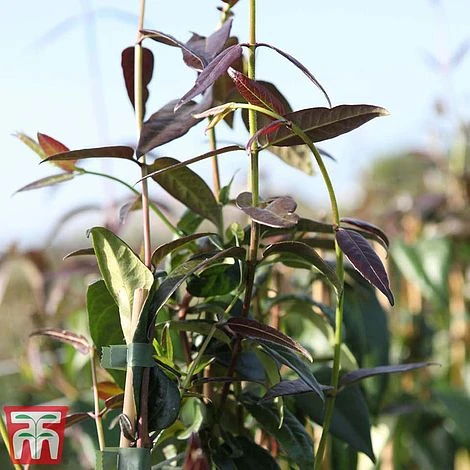 This twining evergreen Honeysuckle is makes an interesting climber for a warm, sheltered spot. Lonicera henryi ‘Copper Beauty’ produces bronzed new foliage in spring that gradually matures to dark green, cloaking the stems from top to bottom. In early summer, golden yellow blooms appear which give way to purple-black berries that are loved by birds. This unusual evergreen honeysuckle is ideal for woodland and cottage garden schemes, where it brings year round colour to the garden. Height: 10m (30’). Spread: 2m (6’).