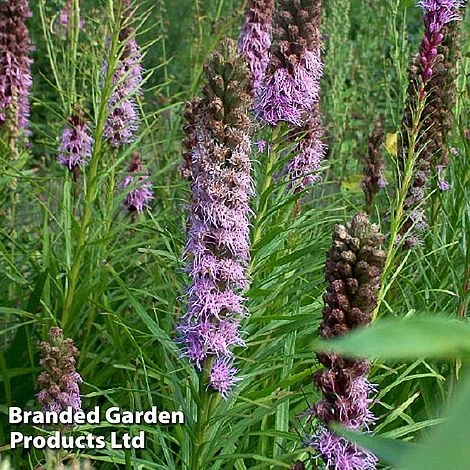 Showy yet undemanding, Liatris spicata ‘Floristan Violet’ is ideal for adding vertical accents and valuable late summer colour to borders and prairie planting schemes. Long-lasting fluffy spires of mauve flowers are produced in August and September, attracting clouds of bees and butterflies to the nectar-rich blooms. Unusually, the flowers open from the top downwards! Thriving in a well-drained spot, this easy, drought-tolerant perennial also makes an excellent cut flower. Height: 90cm (35in). Spread: 45cm (18in).