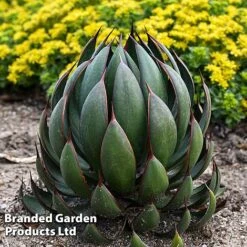 Boasting the architectural qualities of an Agave, but much faster growing, Mangave ‘Blazing Saddles’ makes a striking succulent specimen for a conservatory or patio pot. This indoor/outdoor plant represents a revolution in plant breeding. Mangave is a hybrid cross between an Agave and Manfreda, hardier than an Agave, faster-growing, lacking those vicious spikes and with a fuller, tighter rosette like an Echeveria. Drought tolerant, it will require little watering and can be grown outside all year in areas with very mild winters such as coastal and city gardens, but like most tender perennials, will otherwise need to be brought into a frost-free greenhouse or conservatory over winter. Use it as a striking focal specimen on its own or combine it with other succulents and tropical bedding for a really wow-factor display. Height: 20cm (8in). Spread: 35cm (14in).