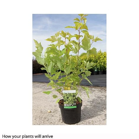 Bright yellow foliage slowly turns greener as the plant matures during the year making Physocarpus opulifolius ‘Darts Gold’ a bright and cheery addition to your beds and borders. With the clusters of small white flowers with just a hint of pink appearing in early summer too, this hardy shrub is perfectly at home in most positions in your garden. Ninebark ‘Darts Gold’ is a compact shrub which will happily grow in partial shade too and could even be used as a screening plant if planted in small groups. Height: 250cm (98″). Spread: 250cm (98″).