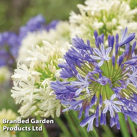 - Agapanthus Blue & White Collection (6 bare root plants) –Â This magnificent mix combines blue Agapanthus ‘Queen of the Ocean’ and white Agapanthus ‘Polar Ice’ for a striking two tone display. In summer, these impressive perennials lend their stature to borders and patio containers, where their architectural seed heads continue the display well into autumn. The large spherical blooms are also magnificent in cut flower displays. Hardy in many parts of the UK, where good drainage and protective winter mulch is provided. Height: 120cm (47″). Spread: 60cm (24″).